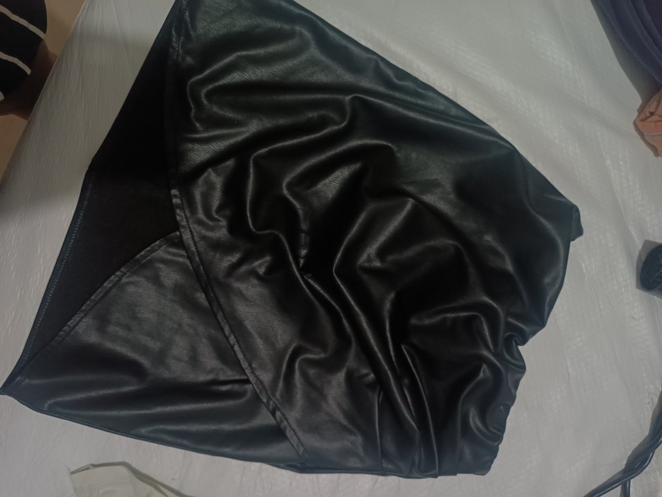 Kadınlar için siyah deri , kısa boy ve vücuda oturan etek Desensiz ve günlük kullanıma uygun.