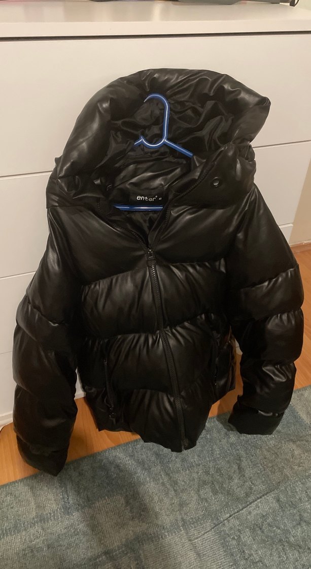 Siyah deri, , yüksek yakalı, kısa kesim kadın mont. Sokak stili ve askılı kollarıyla genç ve günlük kullanıma uygun.