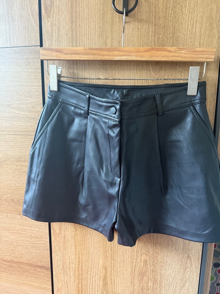 Kemerli bel ve mini boy uzunluğa sahip, siyah, dar kesim deri şort. Düz yüzeyiyle cesur sokak stili için uygun, günlük kullanıma ideal.