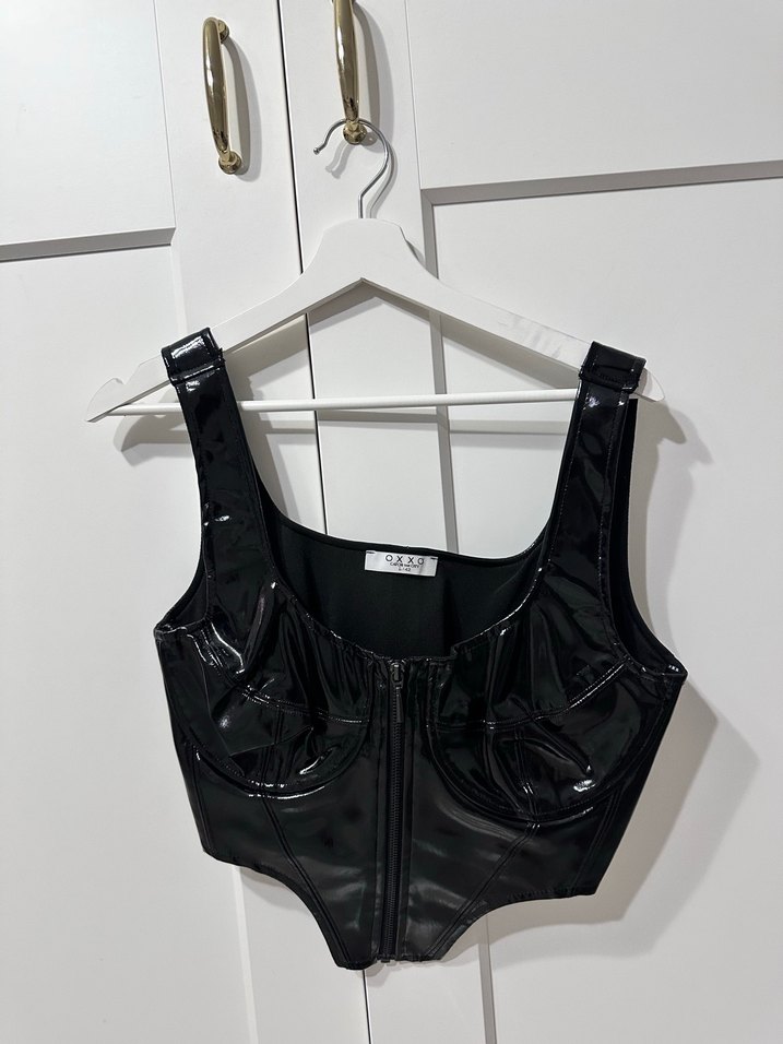 Siyah deri, askılı ve toka detaylı, straplez yaka ve kısa boyda, fitted kesim kadın bustiyer. Gotik tarz için uygun.