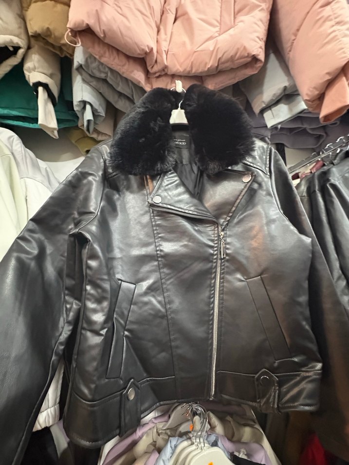 Parlak siyah deri, kürklü yakalı ve askılı kollu, fitted kesim biker ceket. Günlük sokak stiline uygun şık tasarım.