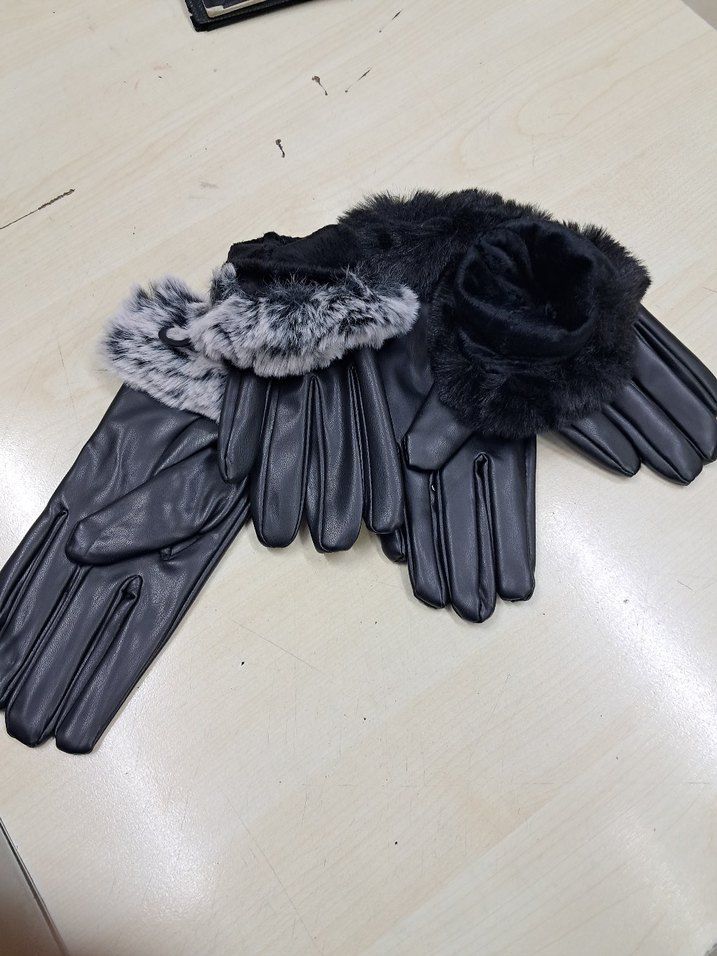 Siyah deri eldivenler, kürk detaylı ve gotik tarzda, rahat ve şık bir görünüme sahip. Moda öncülerine uygun avant-garde tasarım.