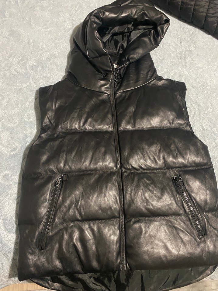 Siyah deri, kürklü kapüşonlu, kolsuz yelek. Yüksek yakalı, dar kesim ve midi boyda, fermuarlı ceplidir, günlük kullanım için uygundur.