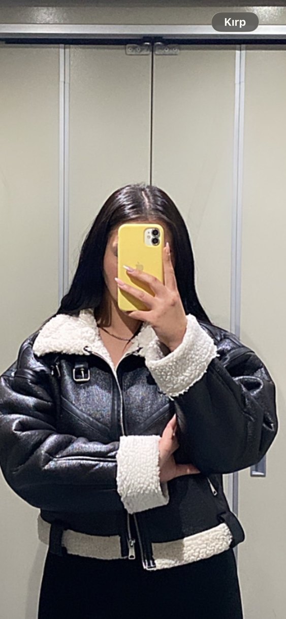 Parlak siyah deri, kürklü yakası ve manşetleriyle, fitted kesim kadın kış ceketi. Uzun kollu, yakalı, rock punk tarzına uygun.
