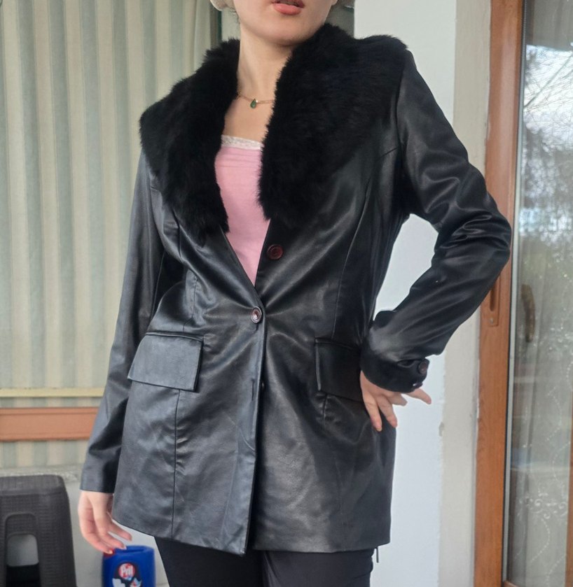 Kadın siyah deri ceket, kürk detaylı yakası ve uzun kolludur. Normal midi boyda, regular fit ve ofis kullanımı için uygundur.