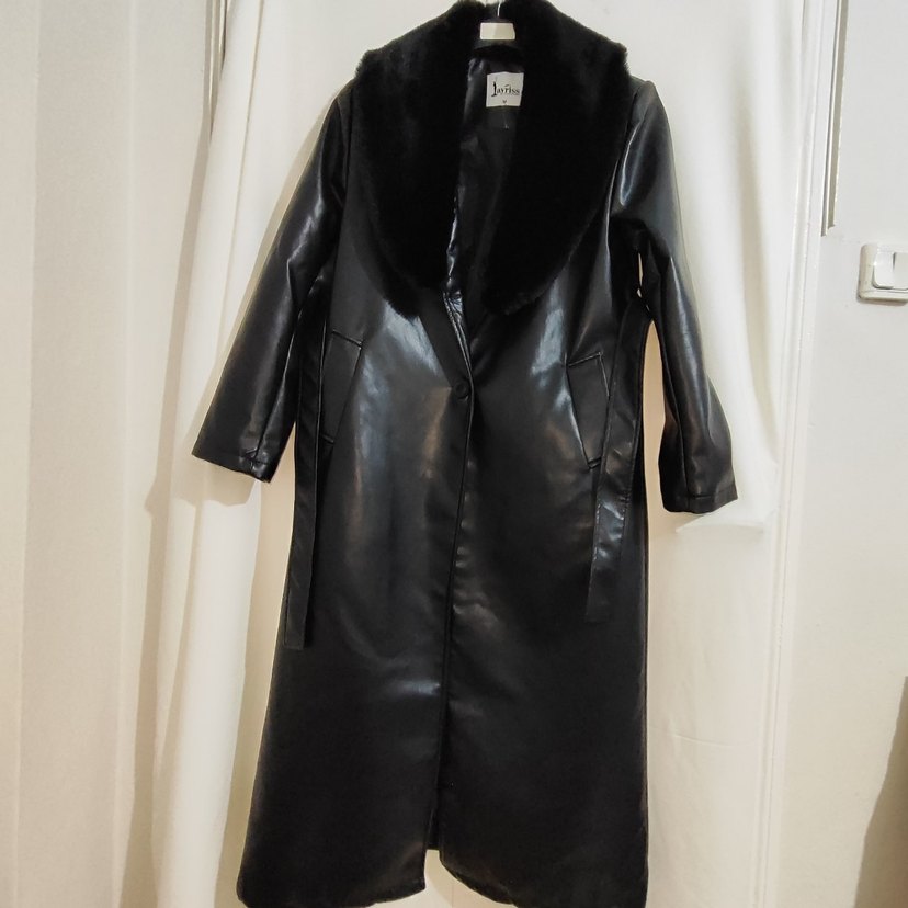 Uzun siyah deri kaban, kürklü yakası ve askılı kollarıyla dikkat çeker. Düzenli kesim ve desensiz tasarıma sahip, ofis için uygun gotik ve Parisli tarzda.