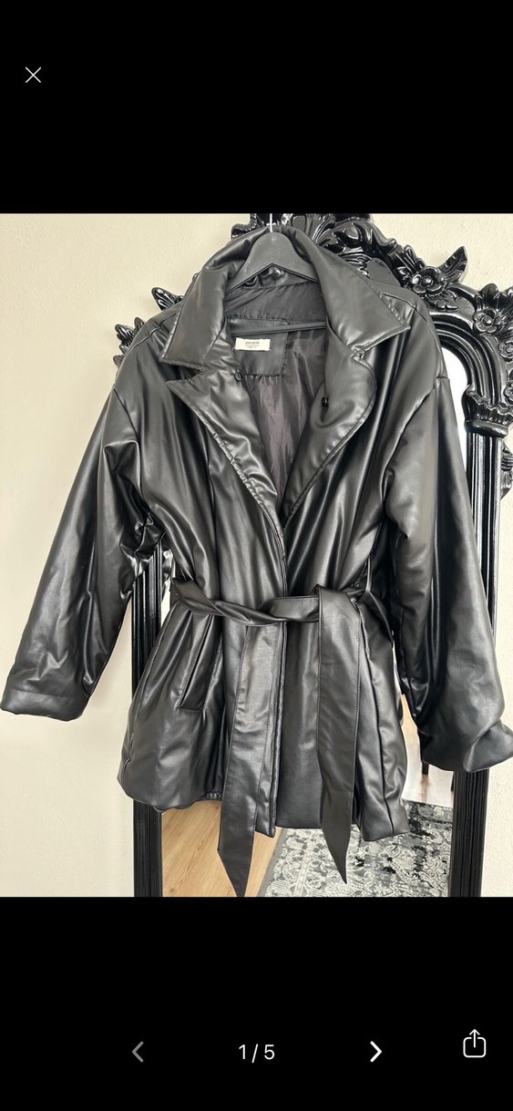 Siyah deri ceket, kuşaklı ve bol kesimdir. Notlu yakası ve askılı kollarıyla günlük kullanıma uygundur.