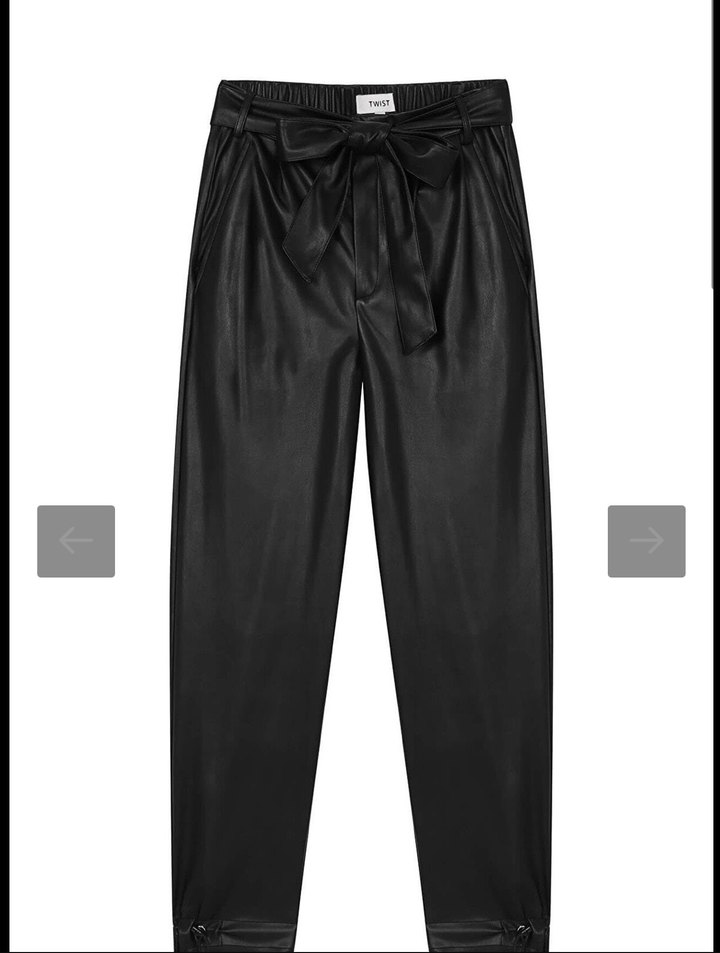 Kadınlar için siyah deri kumaştan, kuşaklı ve bol kesim pantolon. Minimalist sokak stili ve ofis kullanımı için uygundur. Midi boyda ve desensizdir.