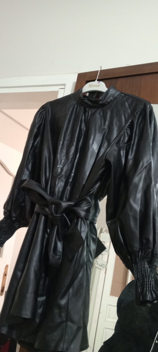 iade yoktur❌Dar kesim siyah deri uzun elbise, yüksek yakalı ve askılı kollu, kuşaklı bel detayıyla gotik tarzda günlük kullanıma uygun.