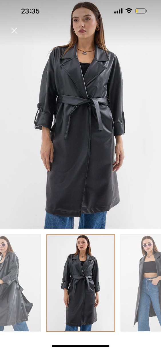 Bu siyah deri trençkot, kuşaklı bel, askılı kollar ve kesik yaka detaylarıyla günlük kullanım için modern sokak stili sunar.