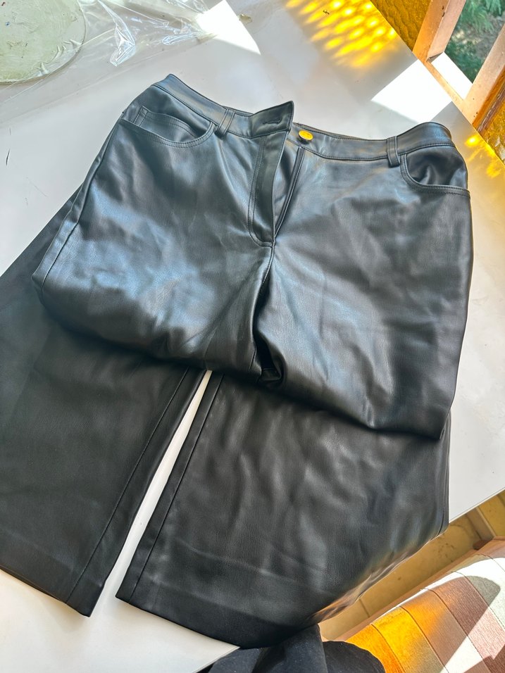 Siyah deri midi uzunlukta, kemerli ve regular fit kadın pantolon. Ofis kullanımı için uygun, desen içermeyen, Paris sokak modasına uygun şık bir parça.