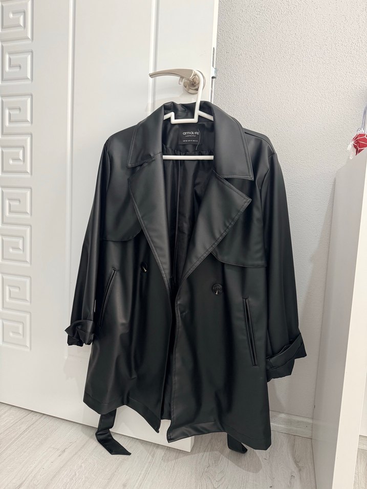 Siyah deri midi ceket, kesik yaka ve askılı kollara sahiptir. Bol kesim ve kuşaklı, günlük rahat kullanım için uygundur.