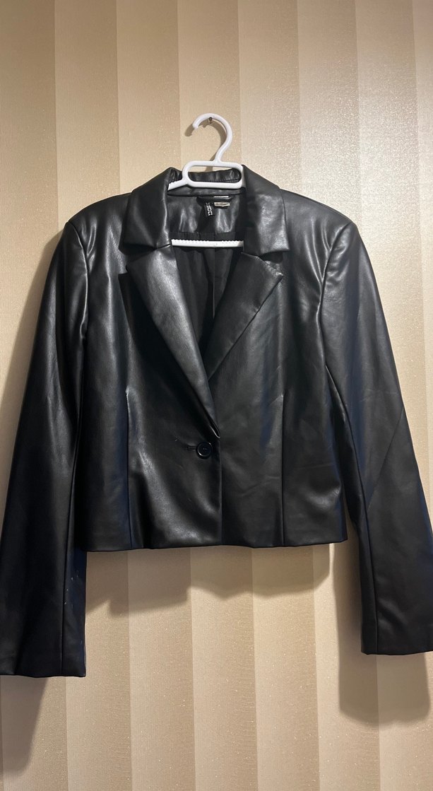 Siyah deri midi ceket, kesik yaka ve düğmeli kapama özelliklerine sahiptir. Uzun kollu ve normal kesim,