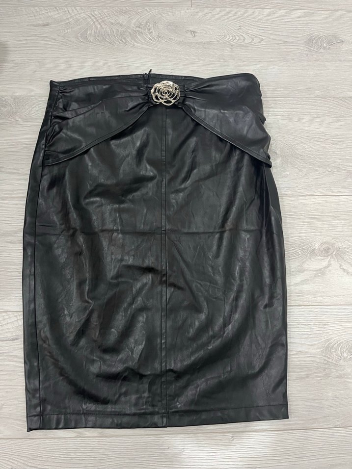 Siyah, deri, beli kemerli ve dekoratif tokalı şık ve dar kesim midi etek. S beden