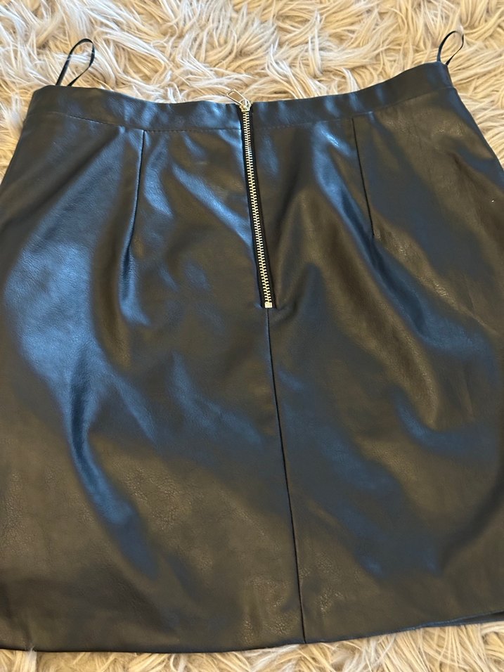 fermuarlı, siyah deri midi etek. Düz ve desensiz yüzeye sahip, gotik ve Paris tarzı. Romantik akşamlar için uygun.