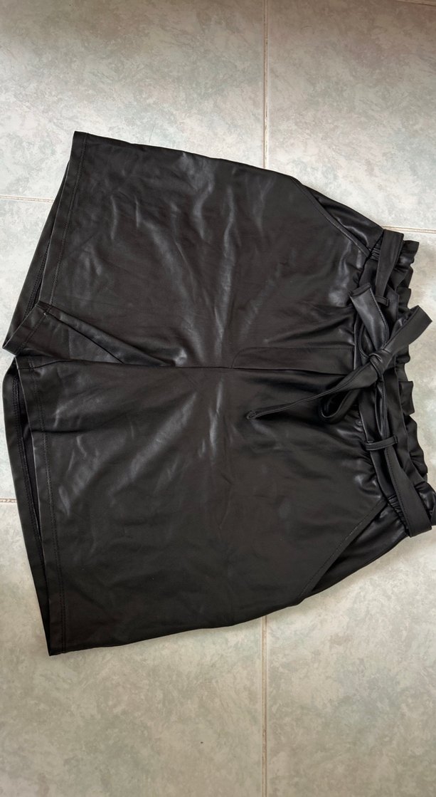 Siyah deri midi şort, bol kesim ve kemerli bel ile goth tarzında, dış mekan kullanımı için uygun. Defo yok