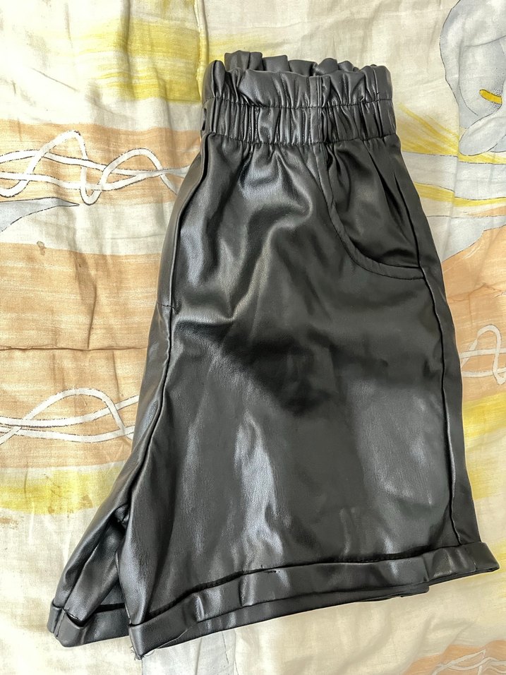 Bel kemerli, bol kesim siyah deri midi şort, sokak modasına uygun şık tasarım.