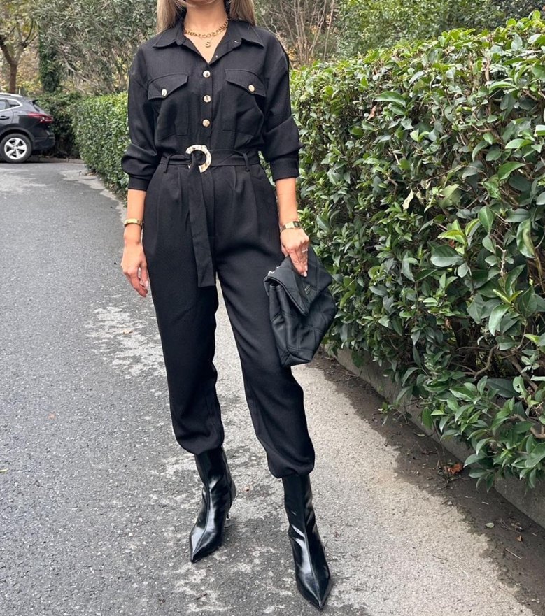 Siyah deri midi tulum, Gömlek yakalı. Bele kadar düğmeli. Beli kuşaklı. Havuç paça. Günlük kullanım için çok şık bir üründür