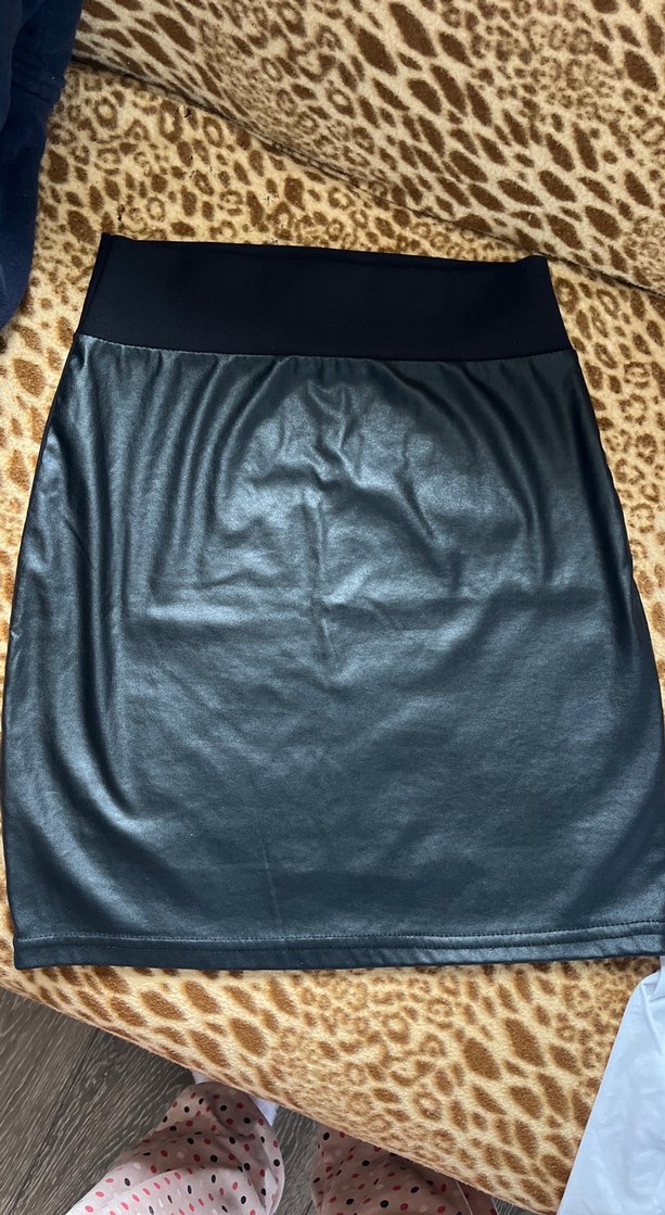 Bu siyah deri mini etek, kemerli ve vücuda oturan kesimiyle ofis için uygun cesur goth tarzını yansıtıyor.