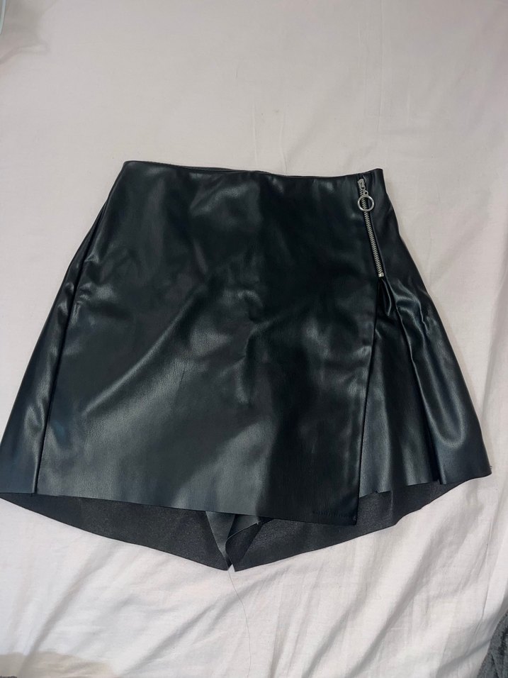 Bu siyah deri mini şort etek, kemerli tasarımı ve yan fermuarıyla dikkat çeker, cesur gotik stil için uygundur.