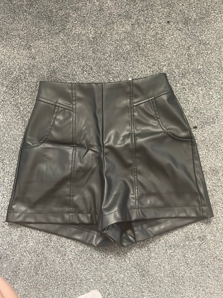 Siyah deri, bel kemerli, mini boy, vücuda oturan kadın şort. Düz yüzeyli ve günlük kullanıma uygun.
