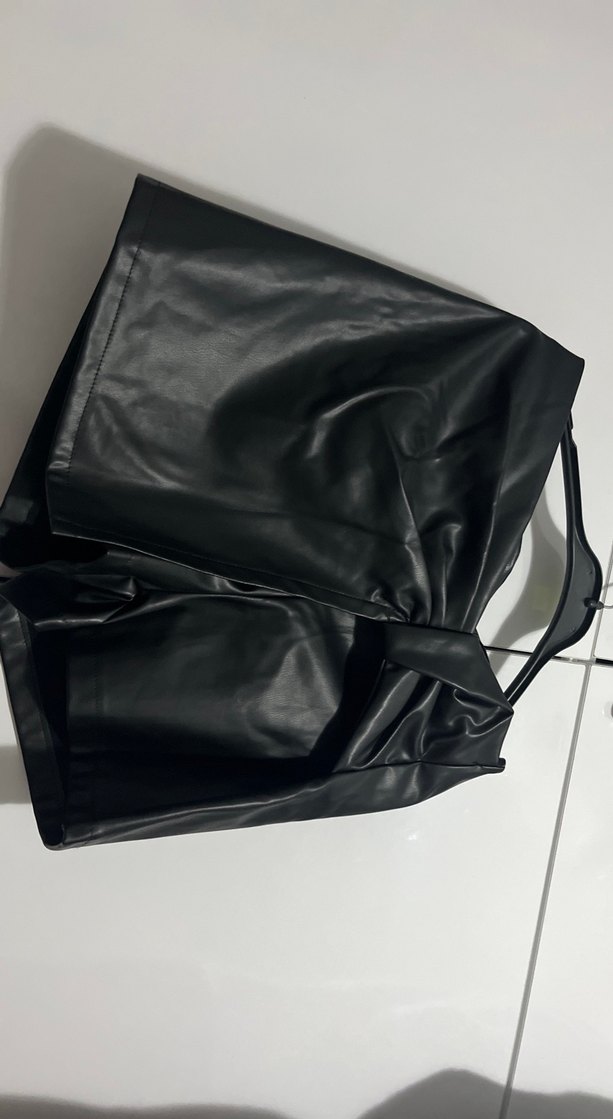 Siyah deri mini şort, belinde tokalı detaylarla, dar kesim ve gotik minimal tarz için uygun. Parti için ideal.