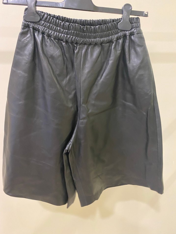 Siyah deri mini şort, bol kesim ve lastikli bel ile rahat ve şık bir sokak stili sunar. Bel ölçüsü 76-80