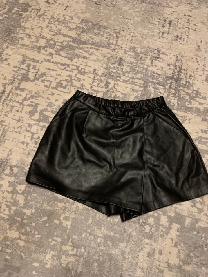 Siyah deri, bol kesim ve kemerli bel detaylı mini şort. Rahat ve sokak stili için uygun, günlük kullanıma ideal.