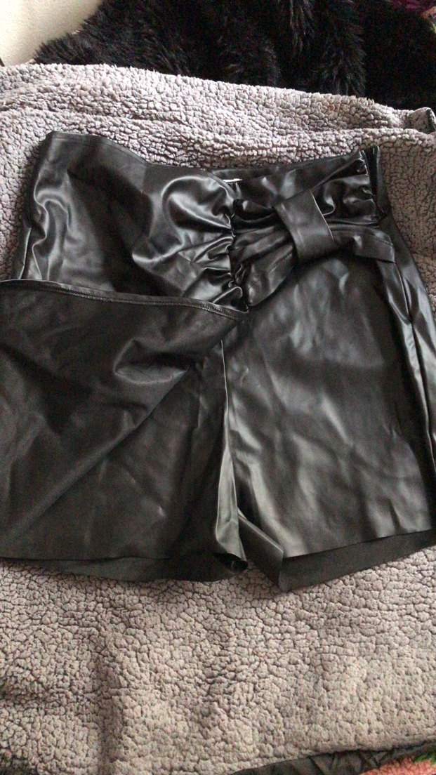Siyah deri mini şort, ve vücuda oturan kesimiyle gotik tarzı yansıtıyor. Romantik akşamlar için ideal.