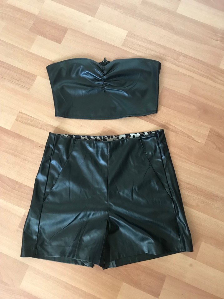 Kadın Siyah Deri Mini Şort ve Bustiyer takım