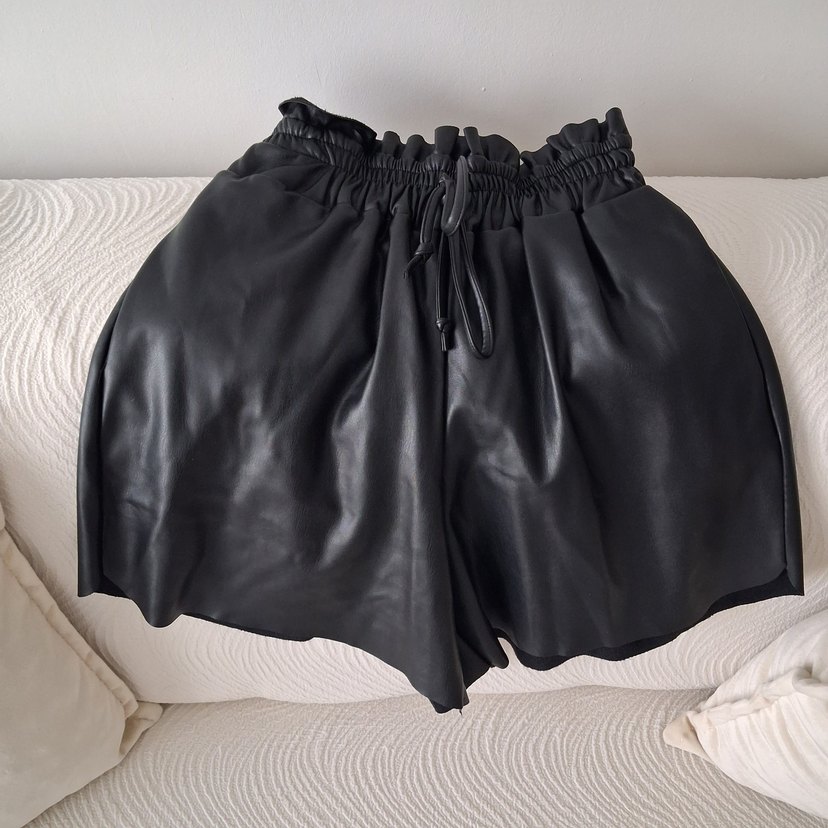 Siyah deri mini şort, bel kısmında fırfır detaylı ve bol kesimdir. Günlük kullanım için gotik tarzda şık bir seçenektir.