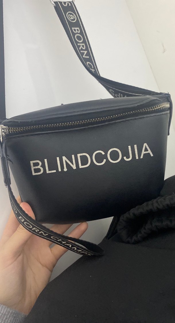 Siyah deri omuz çantası, 'BLINDCOJIA' baskılı ve tokalı askıya sahip, sokak stili için uygun.