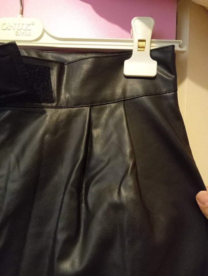 Siyah deri, pileli, boru paça, yüksek bel, cırtlı bel, içi pamuklu, hiç kullanılmamış(zayıflayınca giyerim diye almıştım), cep yok