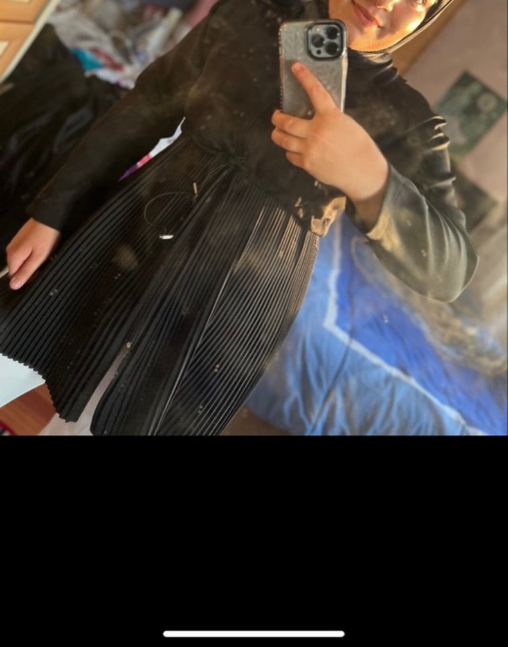 Fitted kesim siyah deri acaba ceket, uzun kollu ve yakası kesik. Pileli midi boy detaylarıyla sokak modasına uygun. Günlük kullanıma uygundur.