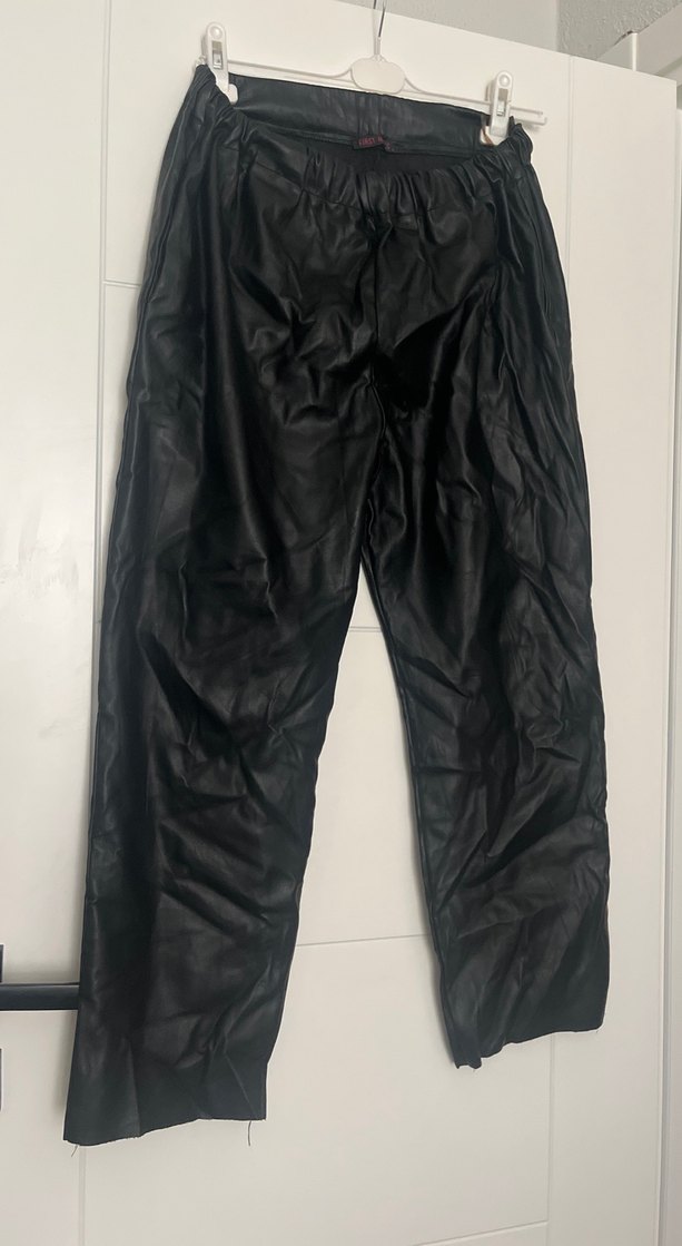 Kadınlar için siyah deri midi pantolon, bol kesim ve pileli tasarıma sahip, sokak modası ve açık hava kullanımı için uygundur.