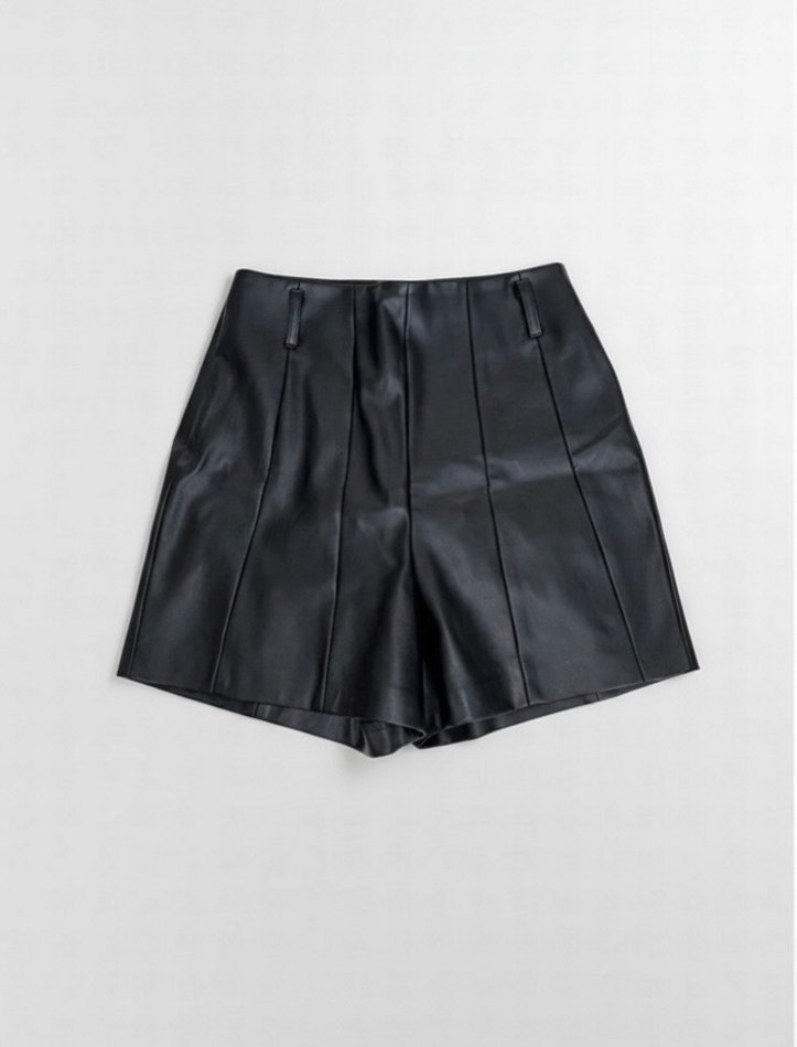 Siyah deri, pileli mini şort. Regular fit ve minimalist sokak stiliyle günlük kullanıma uygun.