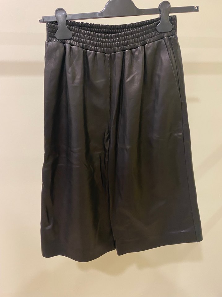 Arket marka Siyah deri, pilili ve bol kesim mini kadın şort. Rahatlık için lastikli bel detayına sahip olup, sokak ve athleisure tarzına uygundur. Günlük kullanıma uygun. Bel ölçüsü 78-80