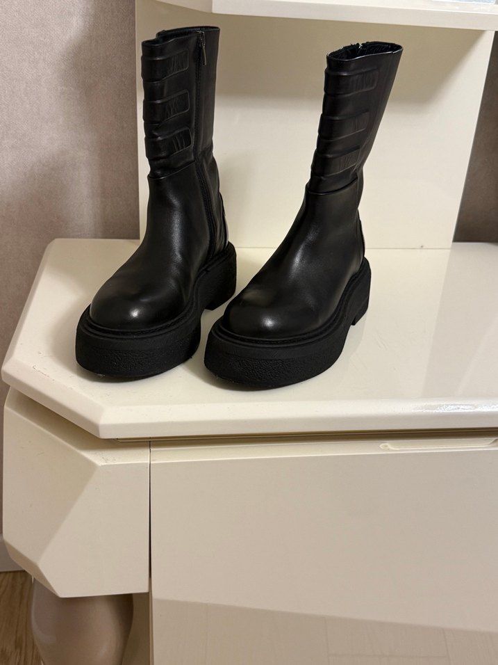Siyah deri, tokalı, platform topuklu goth botlar. Modaya uygun ve avangart tarzı yansıtır. Günlük kullanıma uygundur.