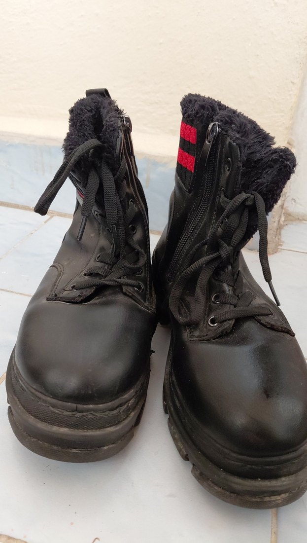 Siyah kauçuk botlar, ince topuklu ve tokalı detaylara sahip. İç kısmı sıcak tutan astarlı, goth tarzda günlük kullanıma uygun.