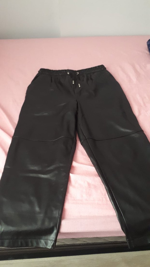 Siyah deri pantolon, lastikli ve rahat kesimlidir. Günlük kullanıma uygun, sokak tarzı midi boyda ve desensizdir. 88-89 cm uzunlugu . M bedendir.