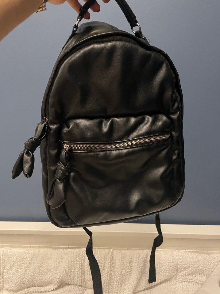 Parlak yüzeyli siyah deri sırt çantası, tokalı detaylara sahip, minimalist sokak stili ve günlük kullanım için uygun. Önünde fermuarlı cep bulunur. Belirttiğim soyulma detayı hariç sıkıntısı yok