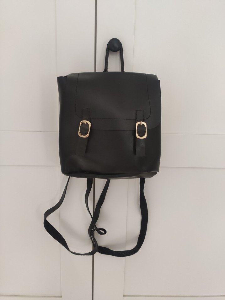 Bu siyah deri görünümlü sırt çantası, günlük kullanım için tokalı sade tasarıma sahiptir, trend sokak stiliyle uyumludur. Hiç kullanılmadı kusursuz küçük çanta.