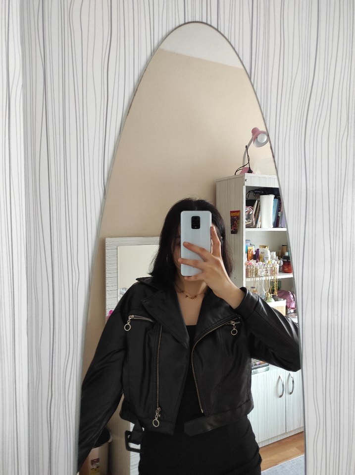 Bu siyah deri ceket, uzun kollu, yüksek yakalı ve şeffaf detaylara sahip olup, goth ve punk sokak stilini günlük kullanıma taşır.