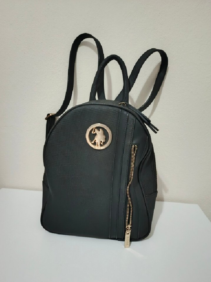 Kadınlar için siyah deri sırt çantası, fermuarlı ve minimal baskılı desene sahip, trend sokak tarzına uygun.