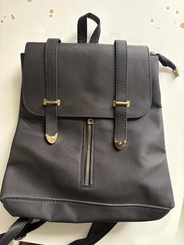 Kadınlar için siyah deri sırt çantası, tokalı kapama ve minimalist tasarıma sahiptir. Önünde fermuarlı cep ve ayarlanabilir askılar bulunur.