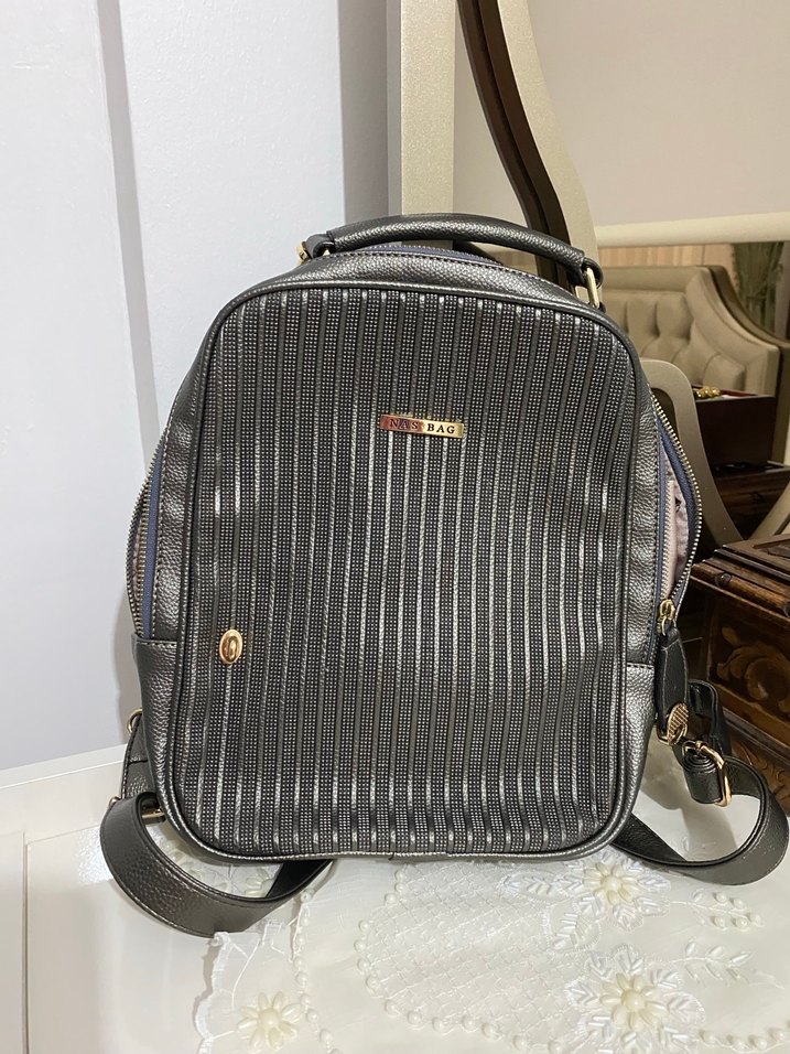 Siyah deri, çizgili ve tokalı kadın sırt çantası. Ürün sayılı kullanıldı deforme yırtık vs yok çantanın içine rolon aktığı için 1 kere yıkandı o yüzden iç yerinde küçük bir yerde leke oluştu başka hiç birşeyi yok alıcısına hayırlı olsun