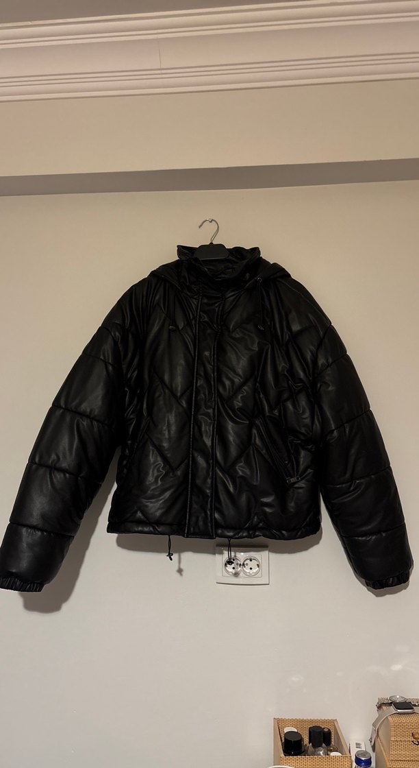 Siyah deri, kapüşonlu, şişme kadın OXXO mont. Uzun kollu ve midi boyda, sokak modasına uygun mont. Nedenini anlamadığım bir şekilde sadece boyun kısmında soyulma mevcut fotoğraflarda gözüküyor. Bedeni m/40 olarak yazıyor, L bedene de olur.