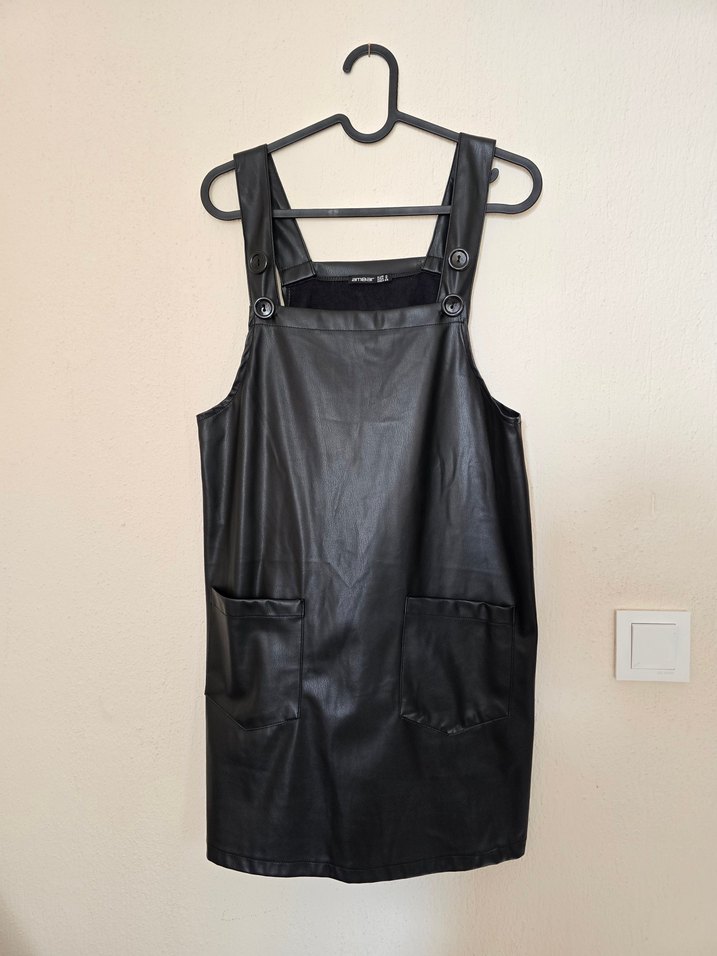 Deri kumaştan, tokalı askılı ve ön cepli, siyah straplez kısa salopet. Grunge punk tarzına uygun, vücuda oturan kesim.