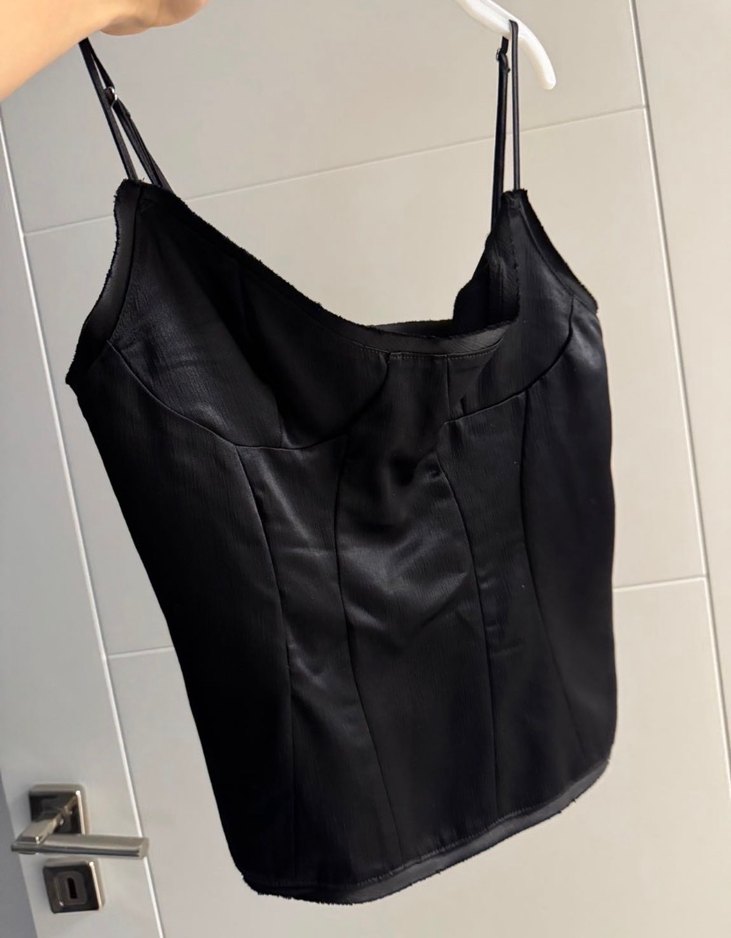 Siyah deri, straplez yaka ve ince askılı, fitted kesim midi bustiyer. Gotik tarzda, Parisienne zarafetiyle günlük kullanıma uygun.