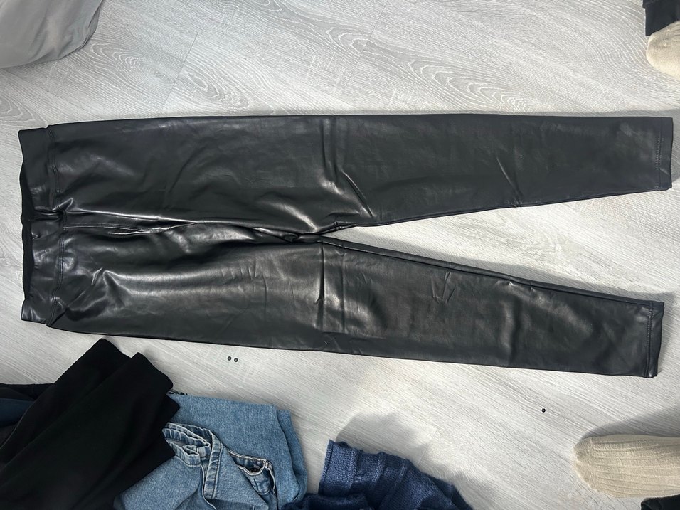 Kadın siyah deri biker tayt ve normal kesime sahiptir. desensiz ve ofis kullanımı için uygundur, sade ve temel sokak stilini yansıtır. ️